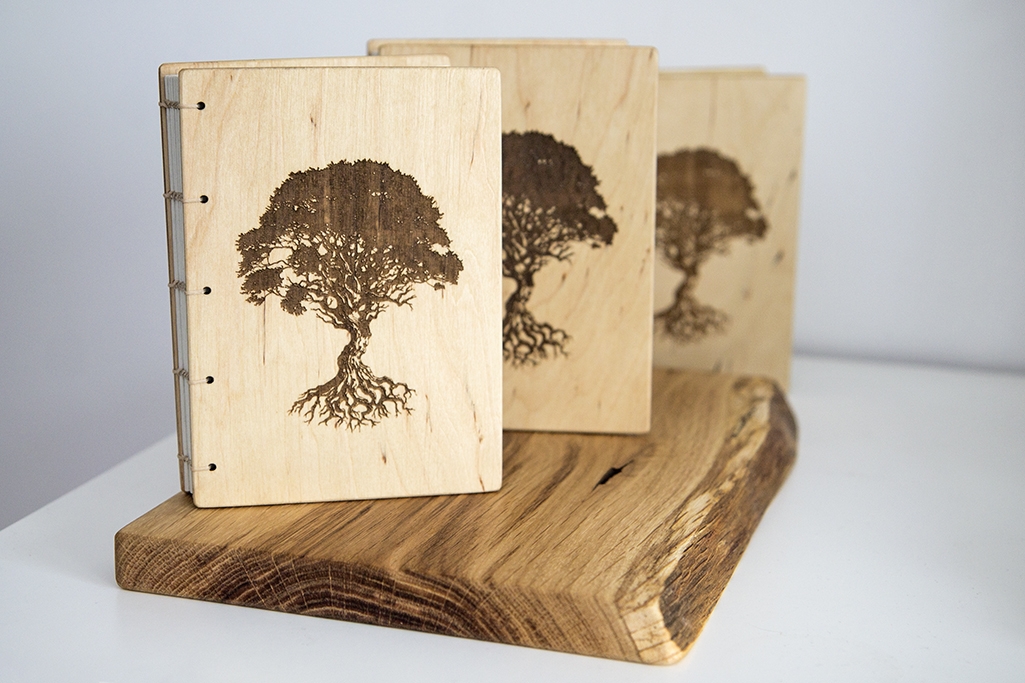 Copertele sunt realizate din lemn masiv sau multistrat, gravate și legate manual cu ață cerată. Fiecare agendă/caiet conține 180 pagini, disponibile atât în variantă albă, cât și reciclată. La cerere, oferim opțiunea de a folosi hârtie colorată, perfectă pentru a adăuga un strop de creativitate.