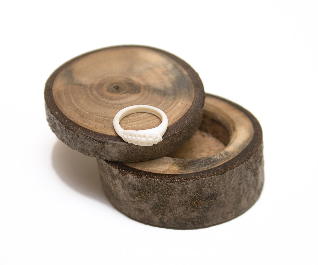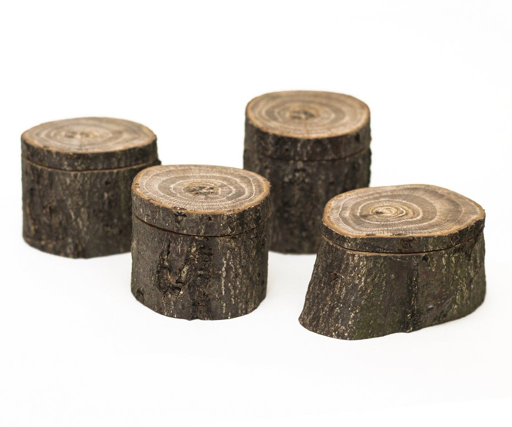 Aceste cutii mici cu capac sunt realizate manual din crengi de lemn de diverse esențe. Se pot folosi pentru inele sau pentru depozitarea obiectelor mici. Finisajul se realizează cu un amestec pe bază de uleiuri naturale, îmbogățit cu rășini și ceruri.