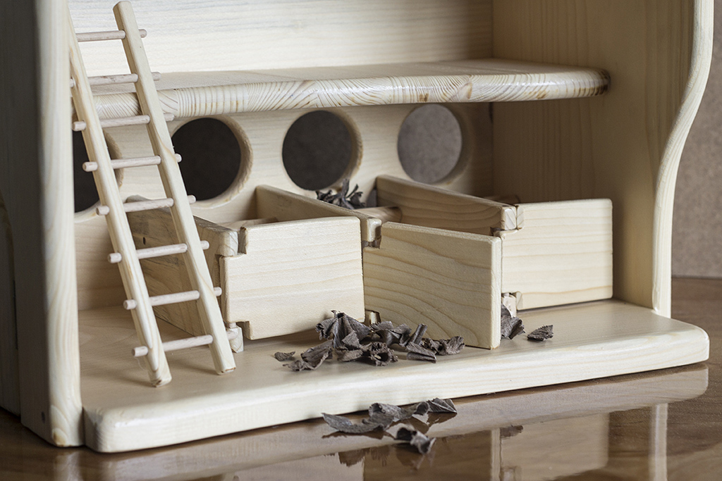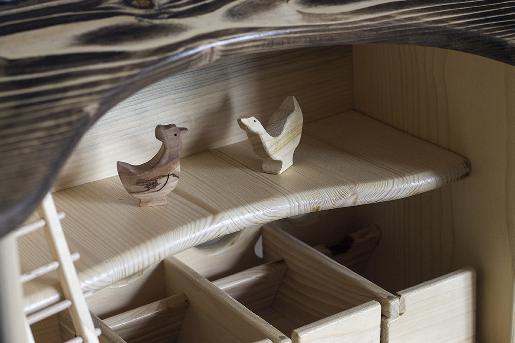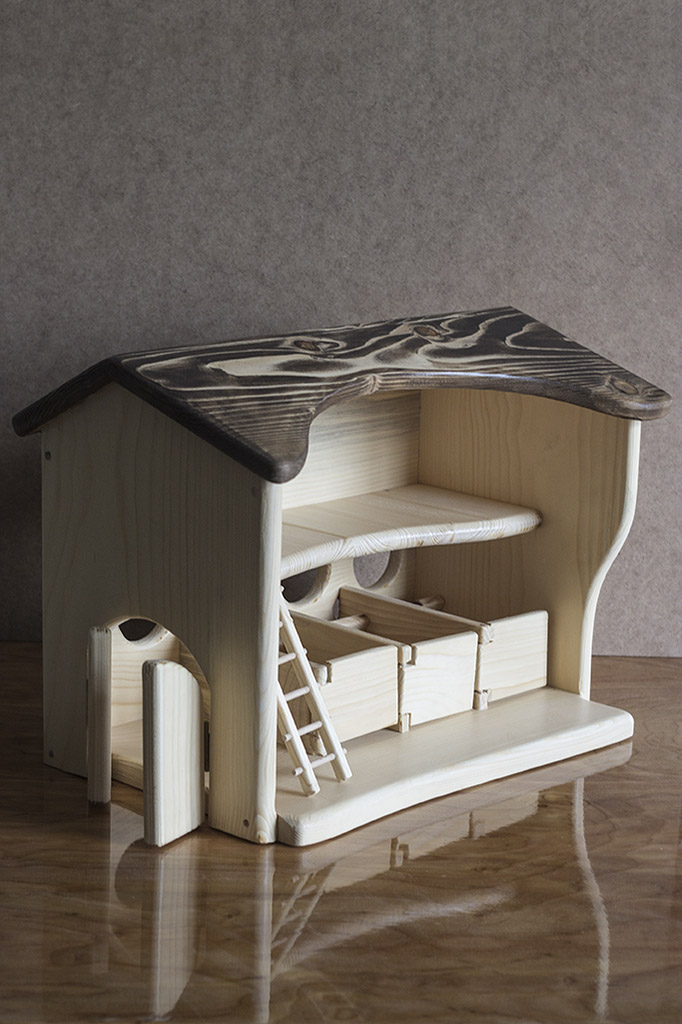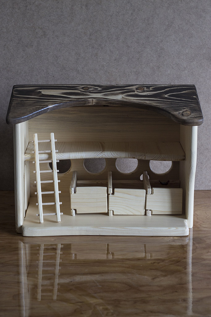 Grajdul pentru păpuși, confecționat din lemn de pin, dispune de un pod cu hambar și trei staule. Cele patru ferestre și ușa dublă de pe lateral dau o notă realistă grajdului.
