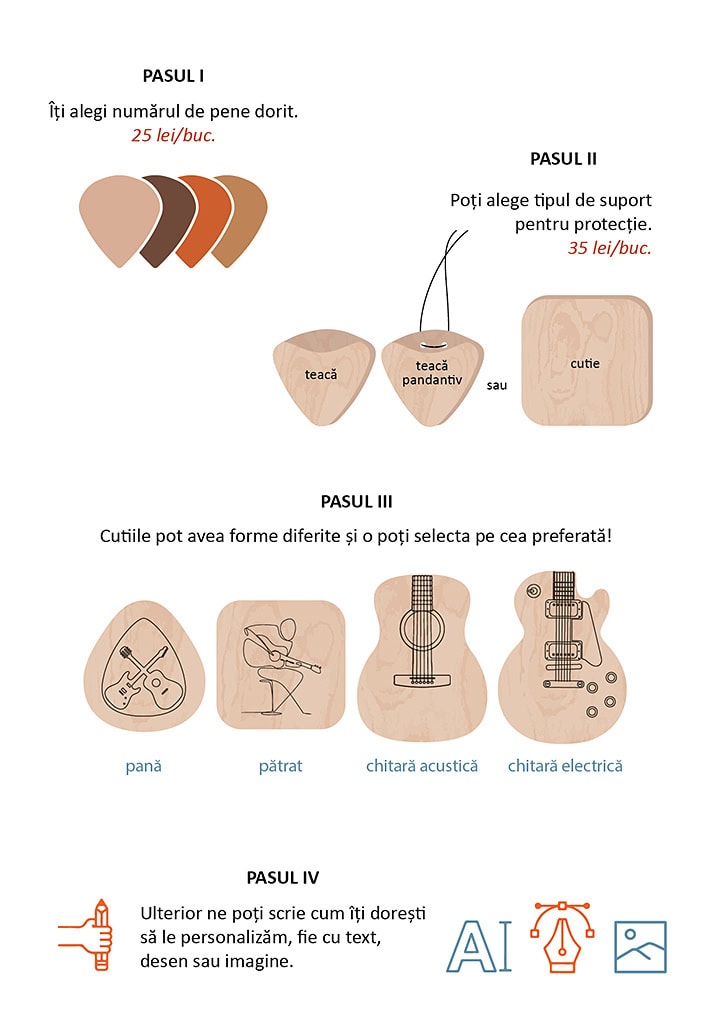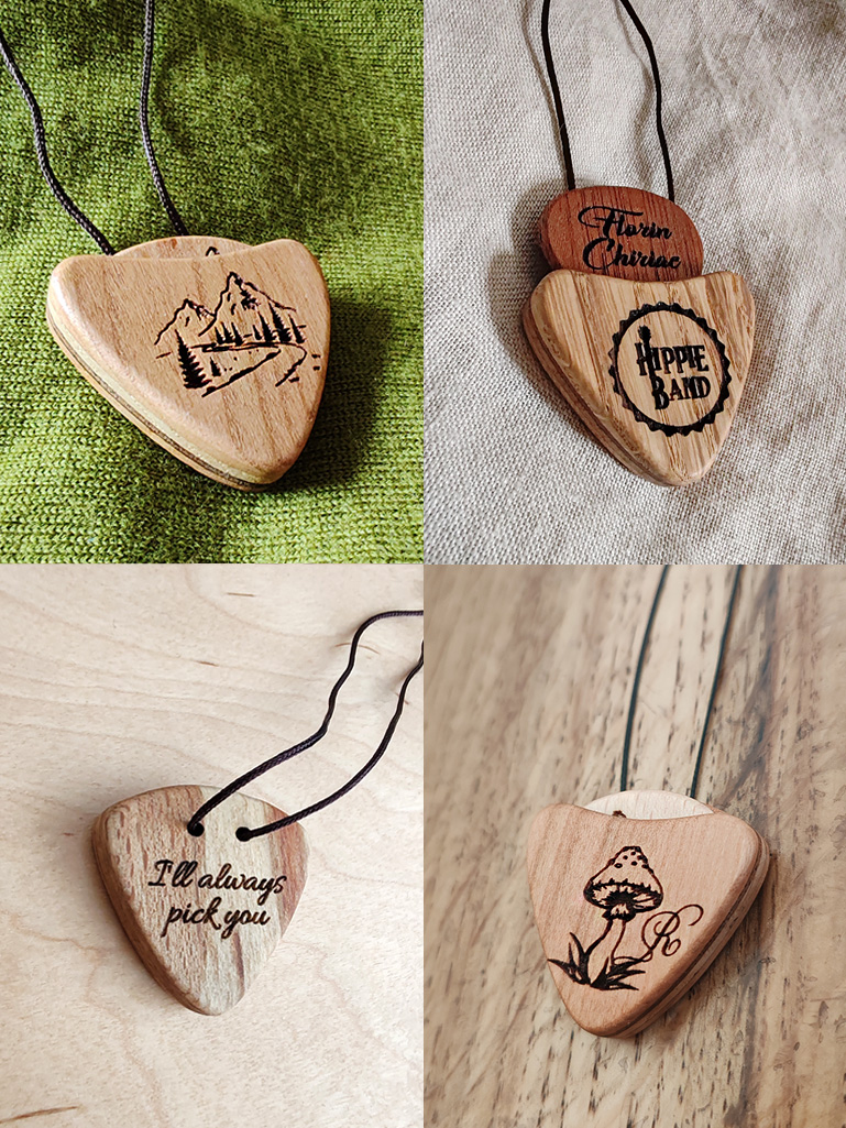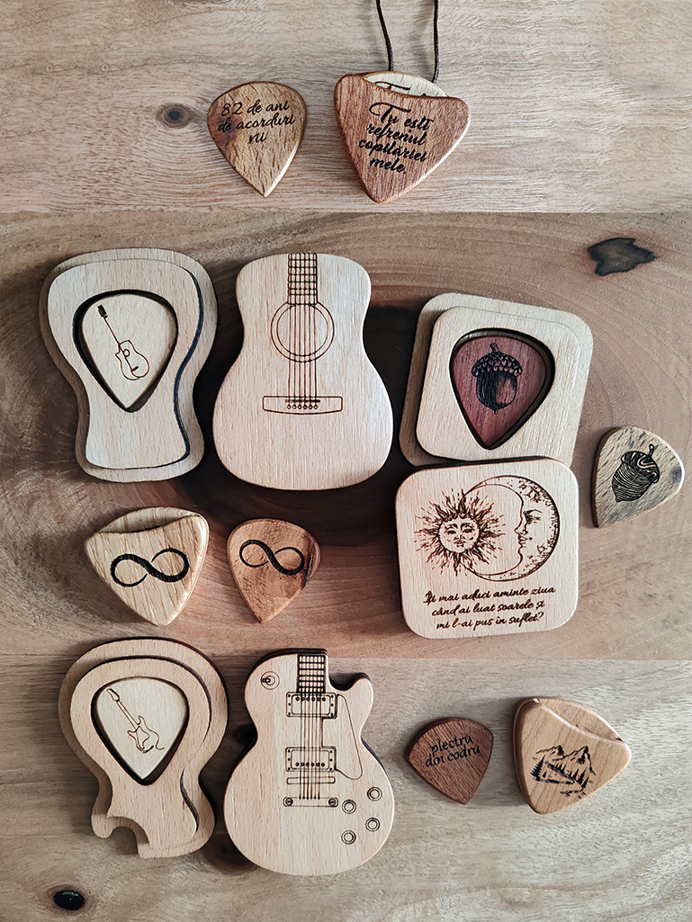 Penele de chitară din lemn sunt o alternativă la penele tradiționale din plastic sau metal, oferind o calitate tonală unică și o experiență de interpretare personalizată. Îți oferim o modalitate de a-ți exprima creativitatea și individualitatea printr-un mesaj scris pentru o persoană dragă, gravat pe o pană de chitară din lemn!