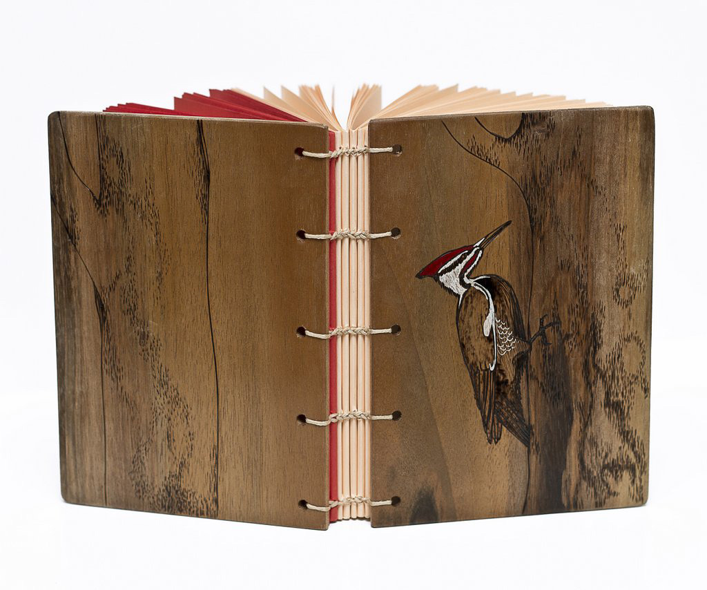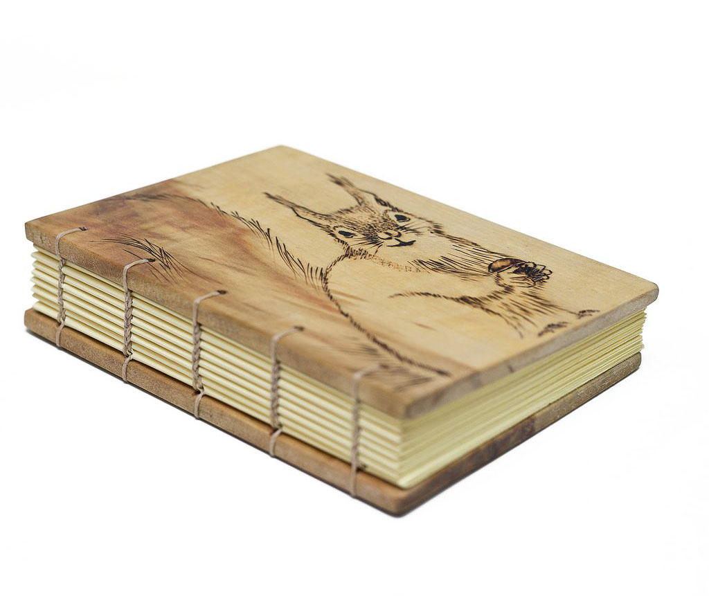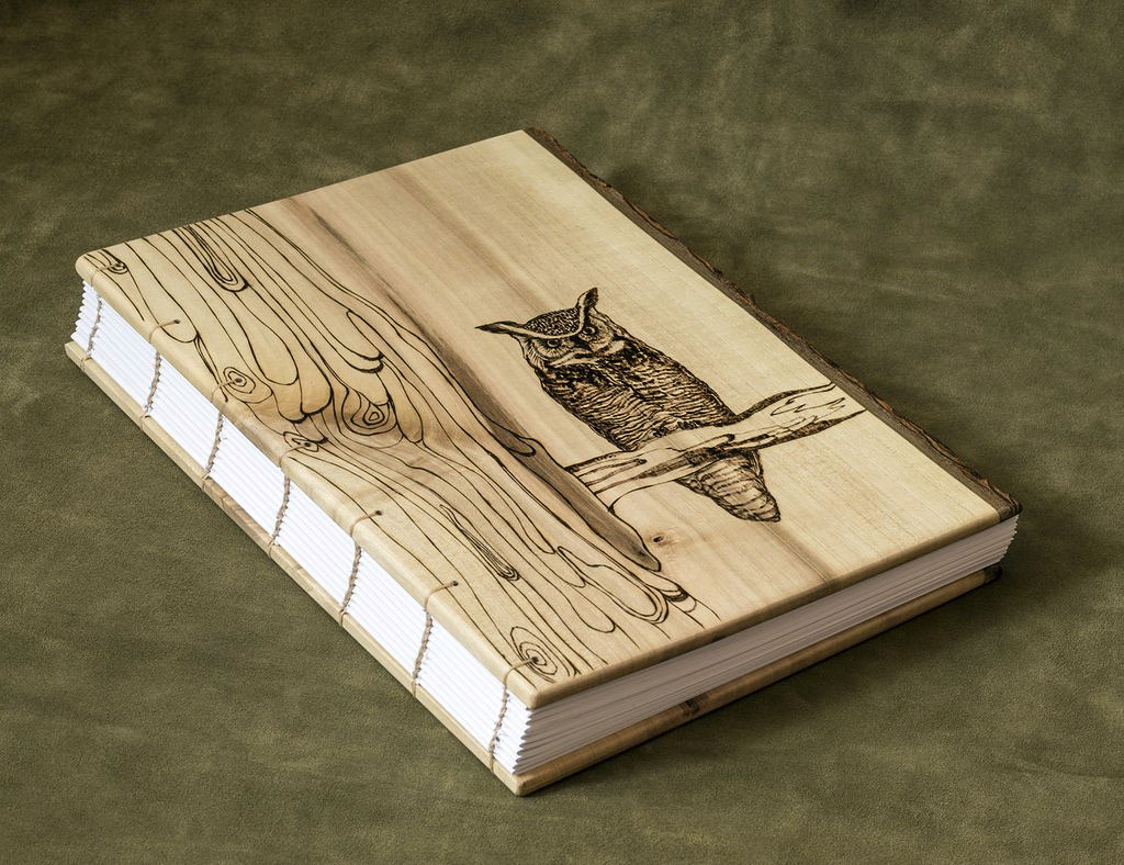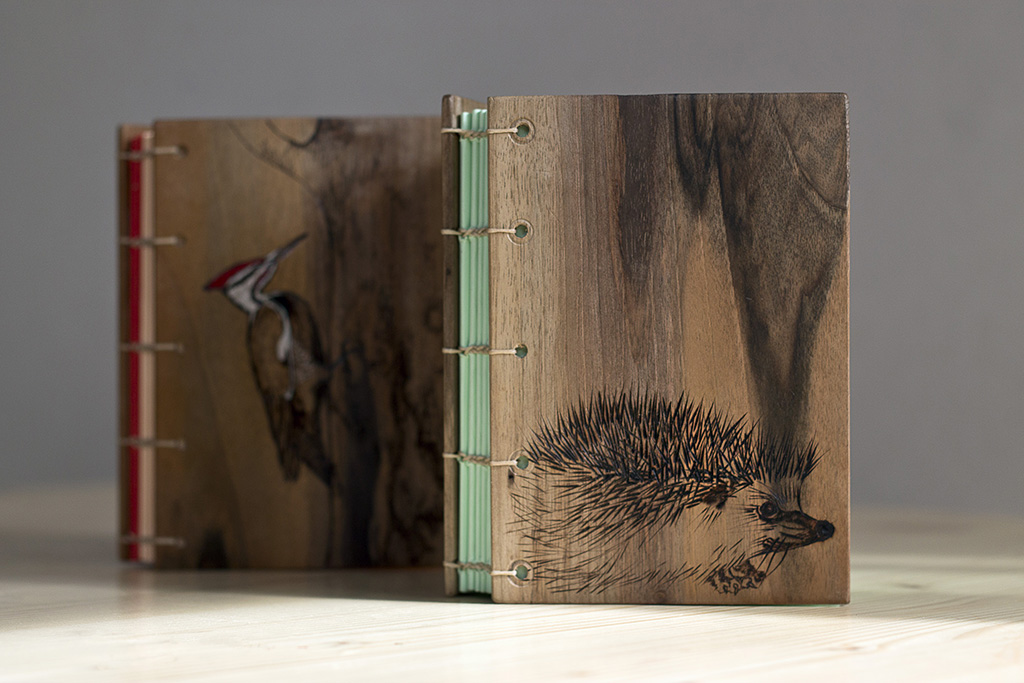 Coperte din lemn masiv de corcoduș, nuc, cireș sau arțar american, finisate cu ceara de albine sau lac pe bază de apă și legate cu hârtie alba sau colorată de 80 g (aproximativ 200 pagini fiecare).
