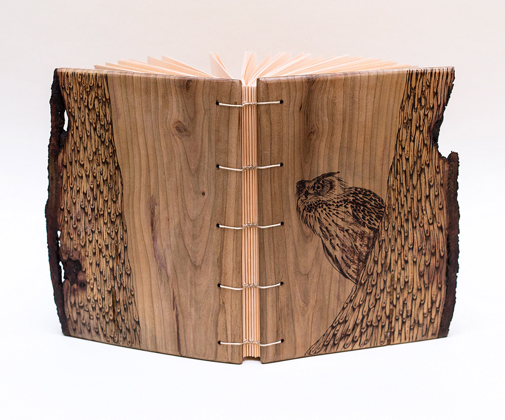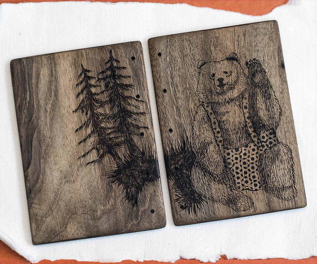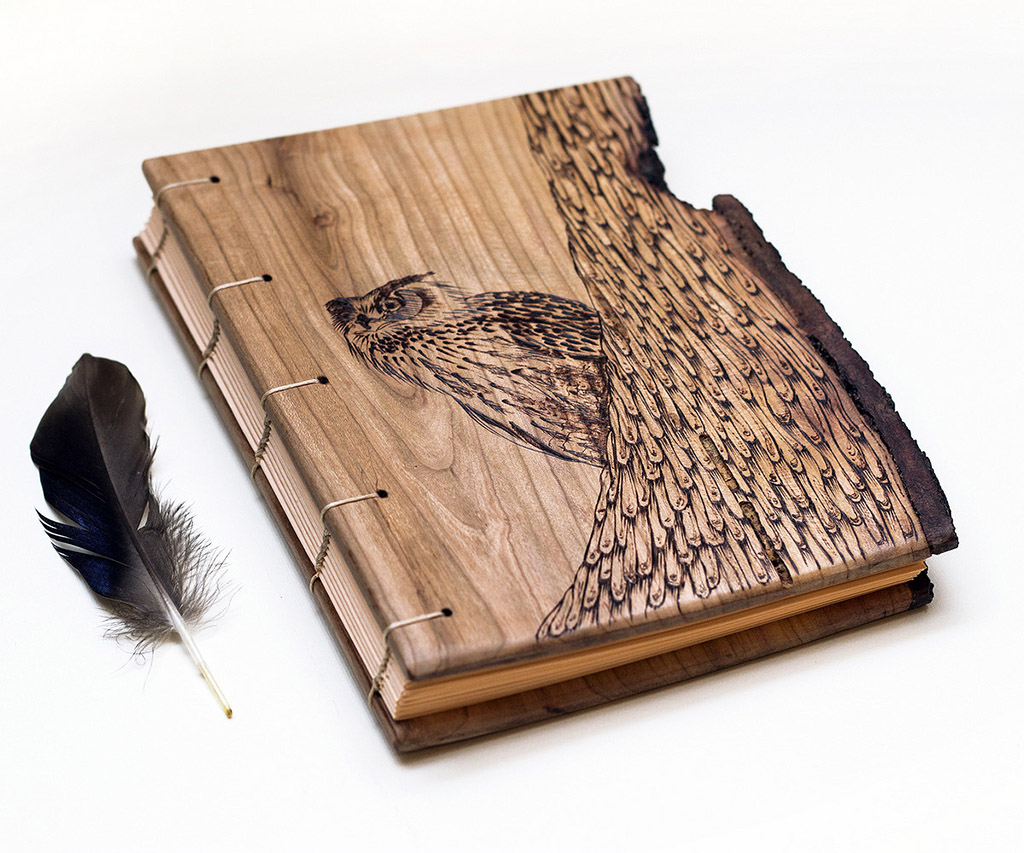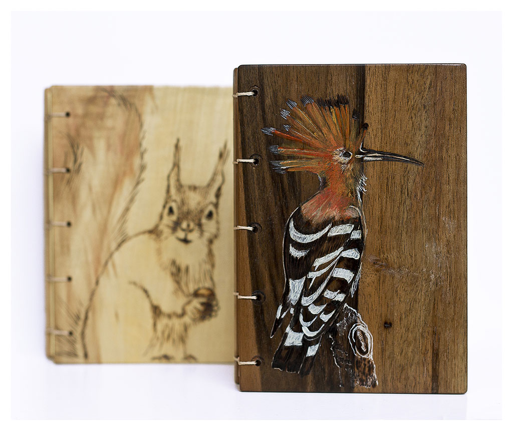 Coperte din lemn masiv de corcoduș, nuc, cireș sau arțar american, finisate cu ceara de albine sau lac pe bază de apă și legate cu hârtie alba sau colorată de 80 g (aproximativ 200 pagini fiecare).