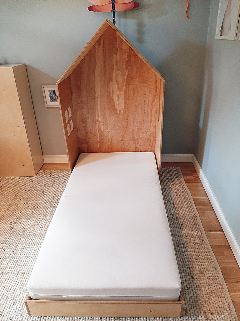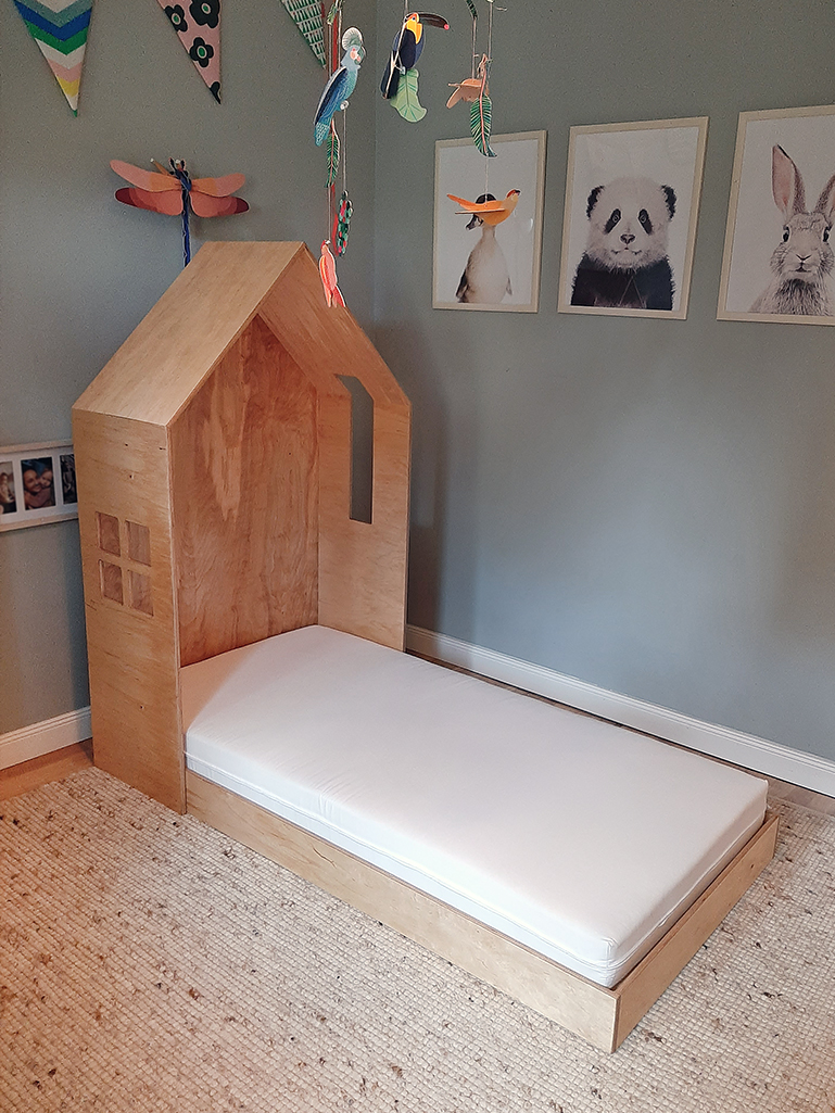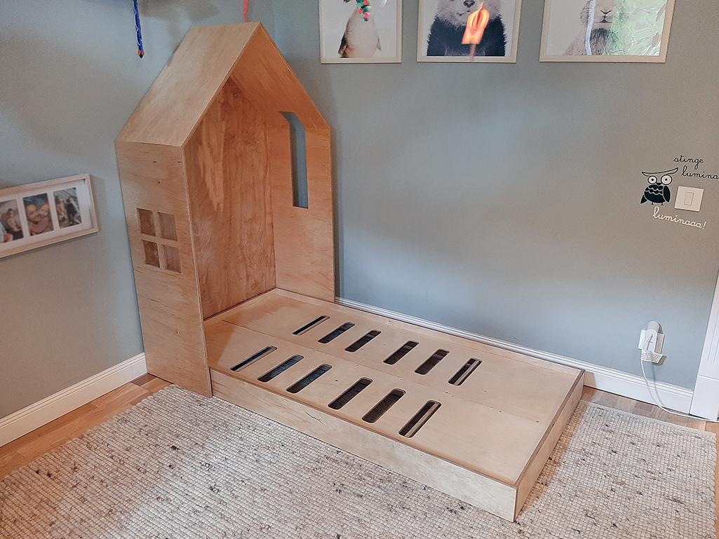 Pat tip căsuță pentru copii realizat la comandă după modelul ales de client. Un pat din lemn de mesteacăn stratificat nu doar că oferă rezistență în timp la sărituri, ci și o estetică naturală, cu nuanțe calde și textură plăcută. Poate fi locul de poveste pentru un somn liniștit și odihnitor.