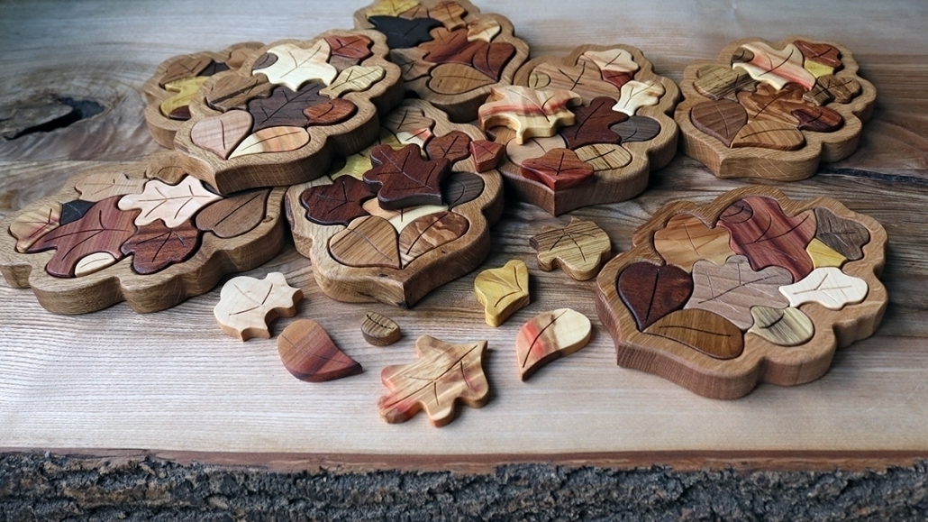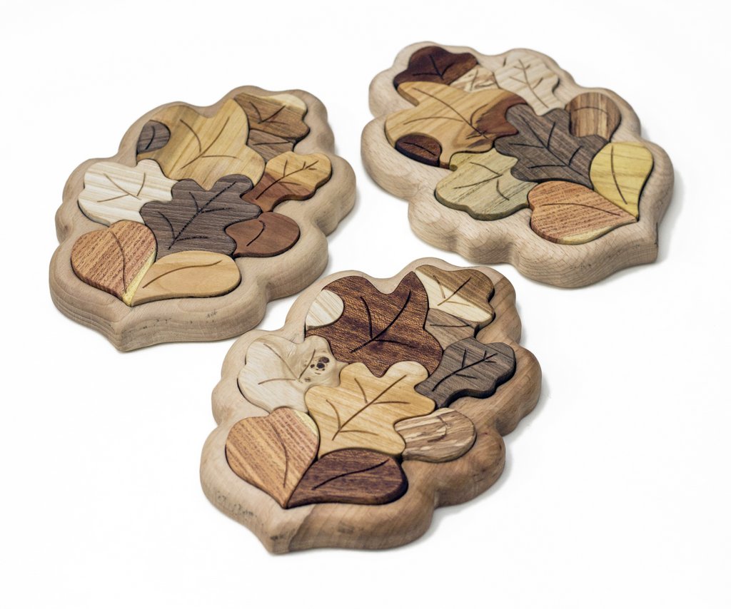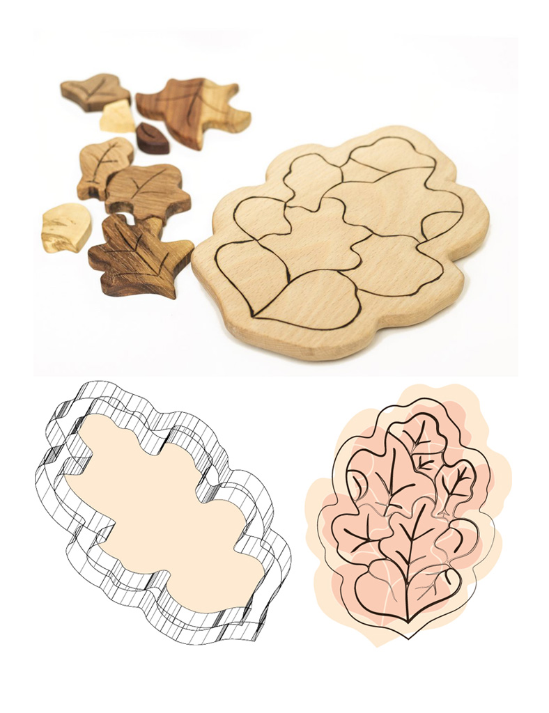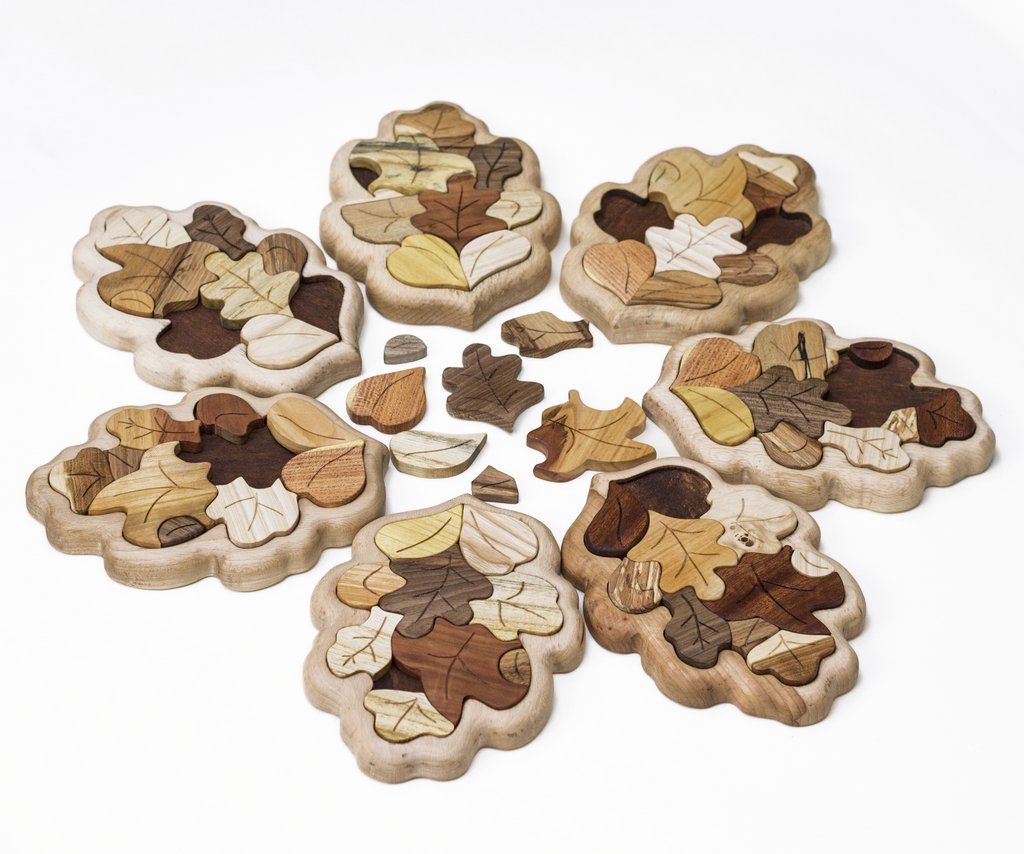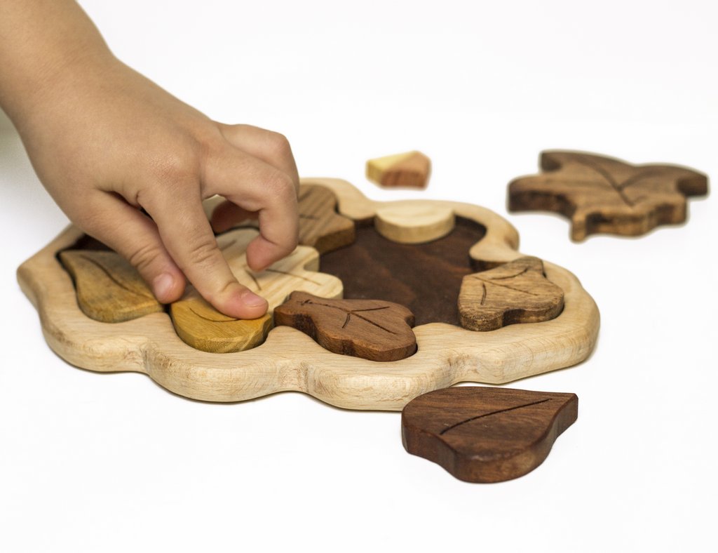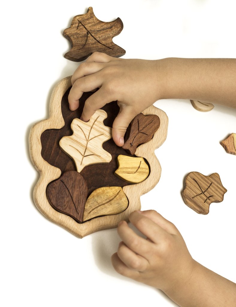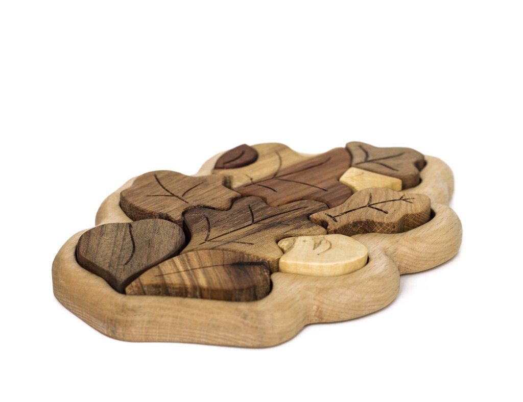 Un joc ce îi apropie pe cei mici de natură, gândit, desenat și realizat de noi. Puzzle-ul în formă de frunză de stejar conține 10 piese – frunze felurite (din lemn de salcâm, ulm, nuc, prun, cireș, stejar, dud, fag) și o tablă din lemn masiv, toate finisate cu ulei și ceară de albine.