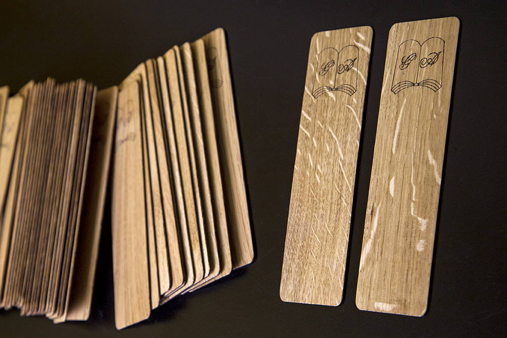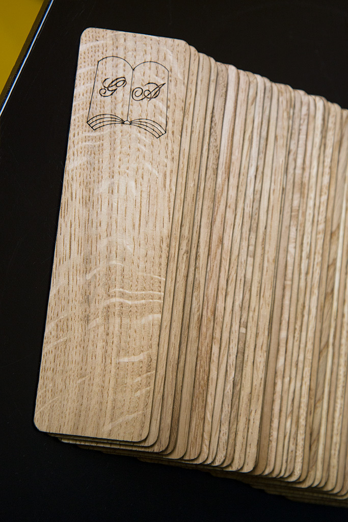 Semne de carte din lemn de stejar, marturii pentru nuntă realizate la cerere și gravate cu desenul clientului.
