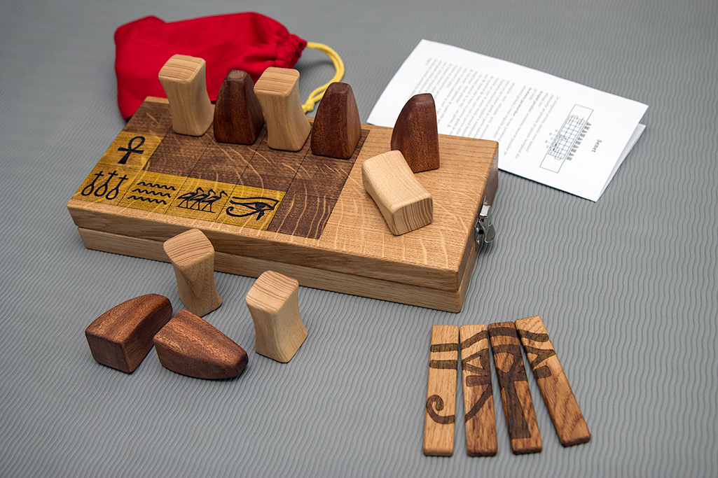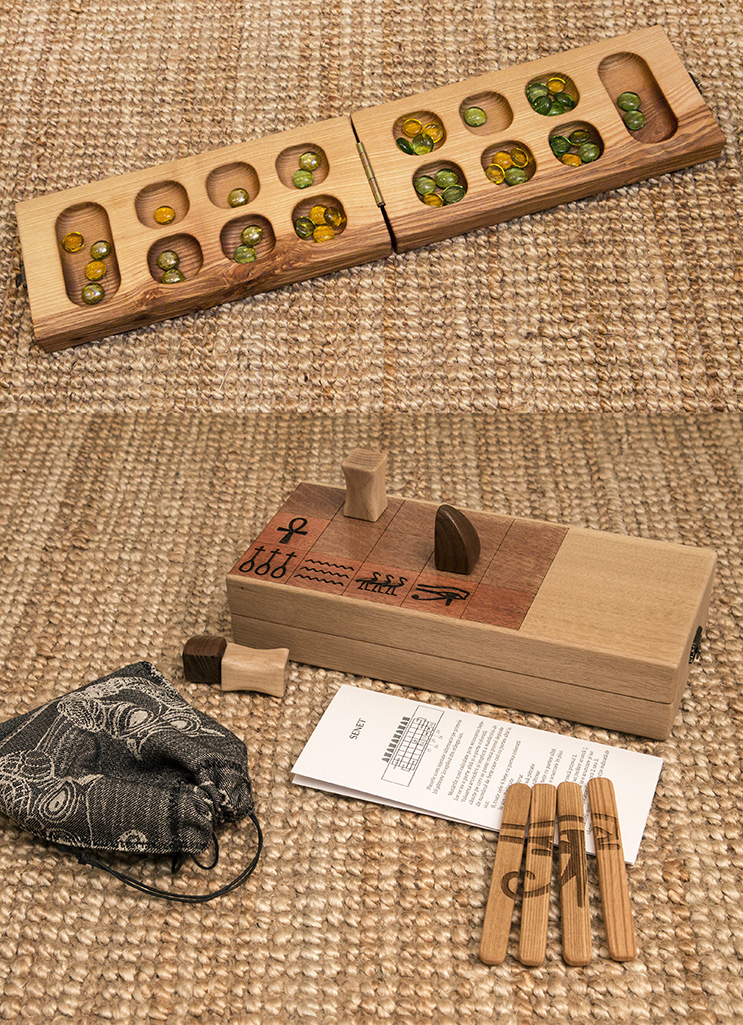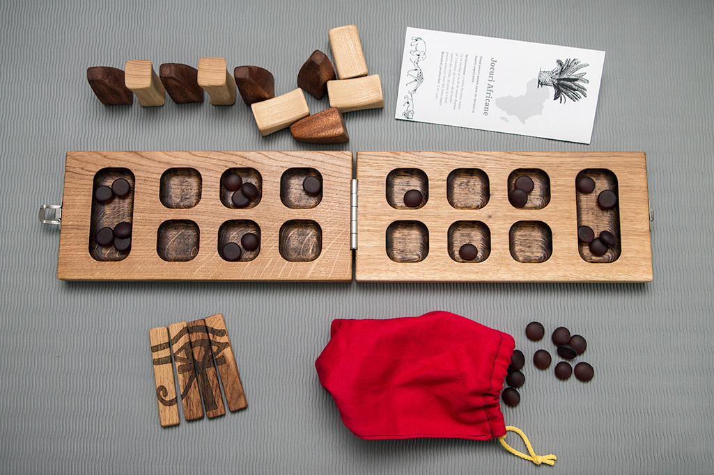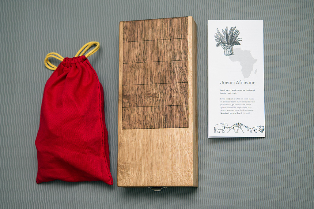 Setul nostru conține o tablă din lemn masiv (frasin, stejar sau fag) cu 14 cavități și cu 30 de căsuțe dispuse pe 3 rânduri, pe verso; 48 de boabe (pietre din sticlă), 10 pioni și 4 bețe pentru aruncat, toate din lemn masiv; 2 săculeți din pânză de in legați cu șnur din ață cerată și un pliant cu reguli pentru ambele jocuri. Tabla este gravată, vopsită cu baiț colorat și lac pe bază de apă; desfășurată are dimensiunile: 60 x 14 cm.