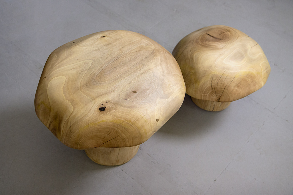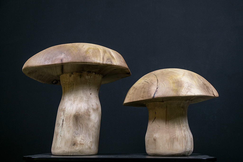 Set sculptat la comandă în lemn masiv, taburet cu măsuță în formă de ciuperci, ideale pentru un decor jucăuș și original, perfecte pentru a aduce un strop de farmec și funcționalitate în orice spațiu interior sau exterior.